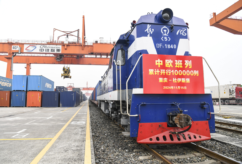2024年11月15日,第10万列中欧班列——X8083次中欧班列(重庆—杜伊斯堡)在重庆团结村中心站准备发车。新华社记者 王全超 摄