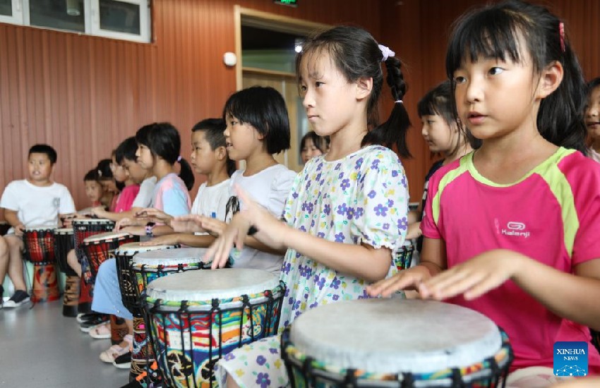 Children learn to play African drums as part of a summer caring program at a primary school in Shenyang on Aug. 4,2022.(Xinhua/Wang Yijie)