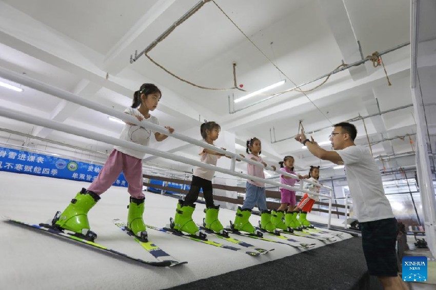 Children learn skiing as part of a summer caring program at a primary school in Shenyang on Aug. 4,2022.(Xinhua/Wang Yijie)