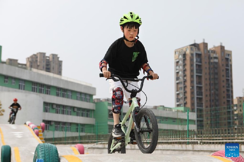 A child practises bicycle riding as part of a summer caring program at a primary school in Shenyang on Aug. 4,2022.(Xinhua/Wang Yijie)