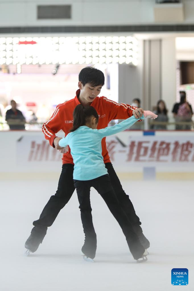 A child learns figure skating under the guidance of a coach at an ice rink in Shenyang on Aug. 4,2022.(Xinhua/Wang Yijie)