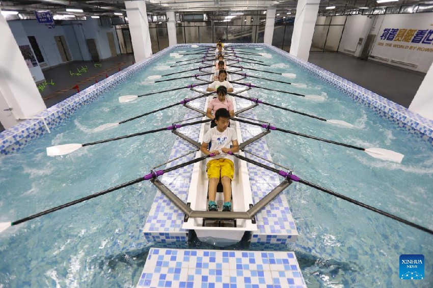 Children practise canoeing as part of a summer caring program at a primary school in Shenyang on Aug. 4,2022.(Xinhua/Wang Yijie)