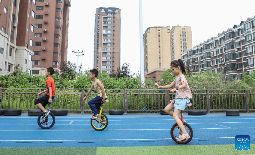 Children practise riding monocycles as part of a summer caring program at a primary school in Shenyang on Aug. 4,2022.(Xinhua/Wang Yijie)