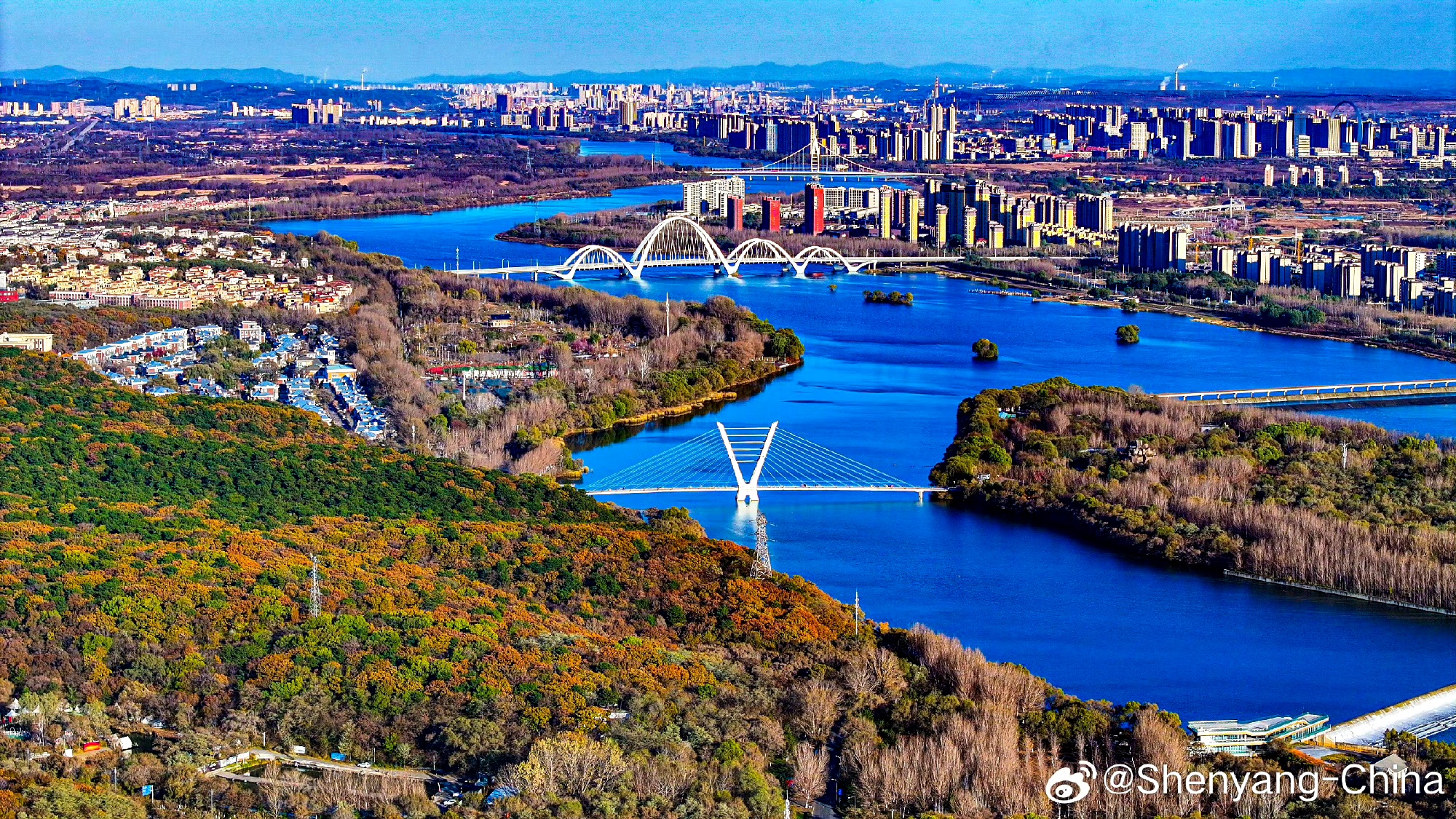 The Hunhe River,resembling a dynamic ribbon,vividly showcases the brilliant colors of late autumn.