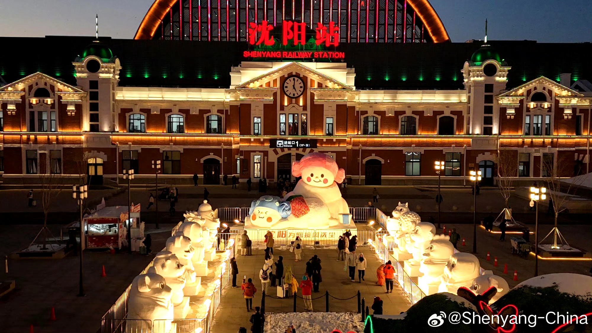 The snowman family and the Chinese zodiac snow sculptures at the East Square of Shenyang Railway Station have won great affection from tourists across the country. At night, illuminated by colorful lights, they are especially adorable and enchanting.