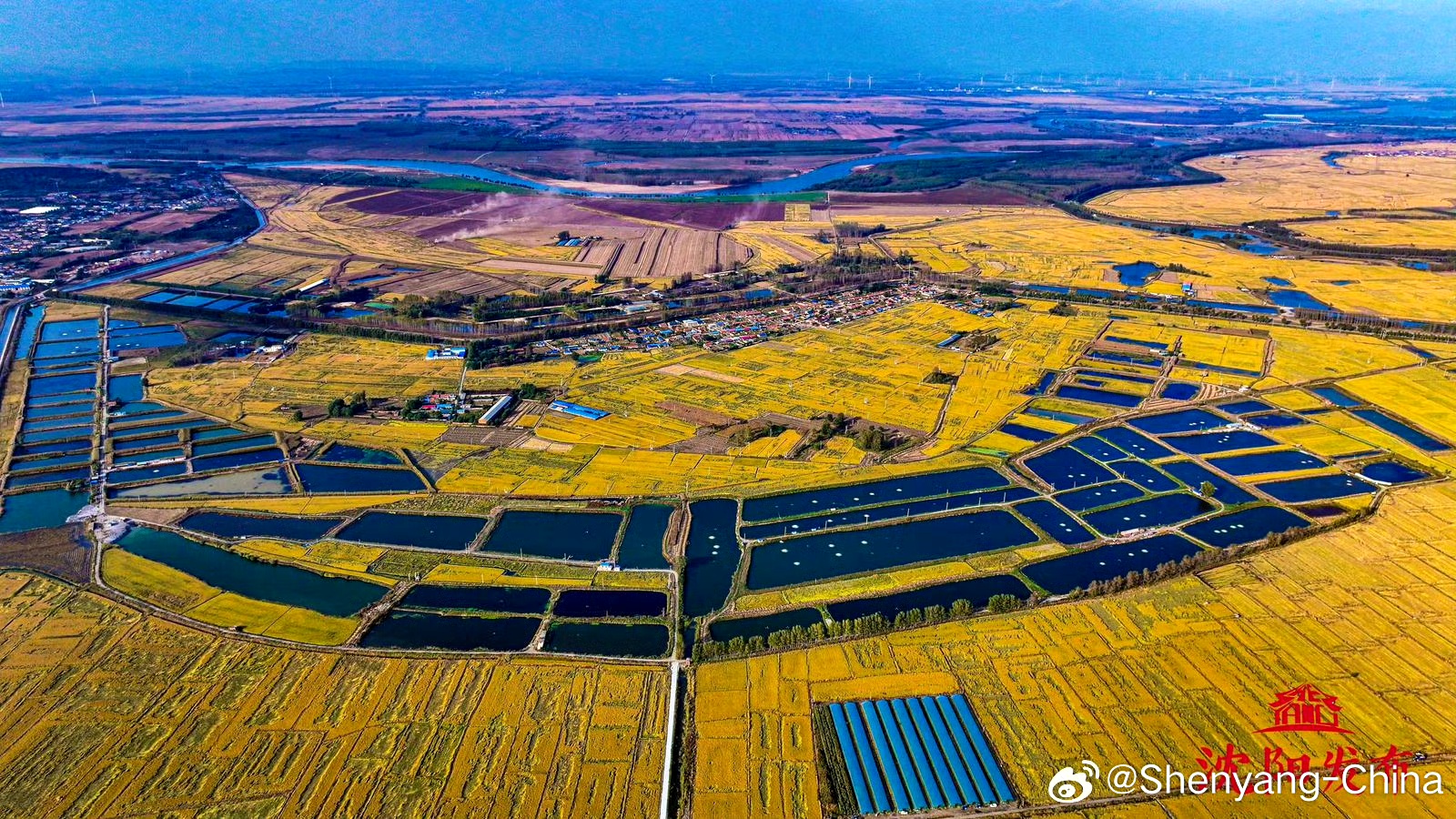 Rice fragrance fills the air along the Liao River, where golden fields and tidy villages paint a bountiful harvest scene.