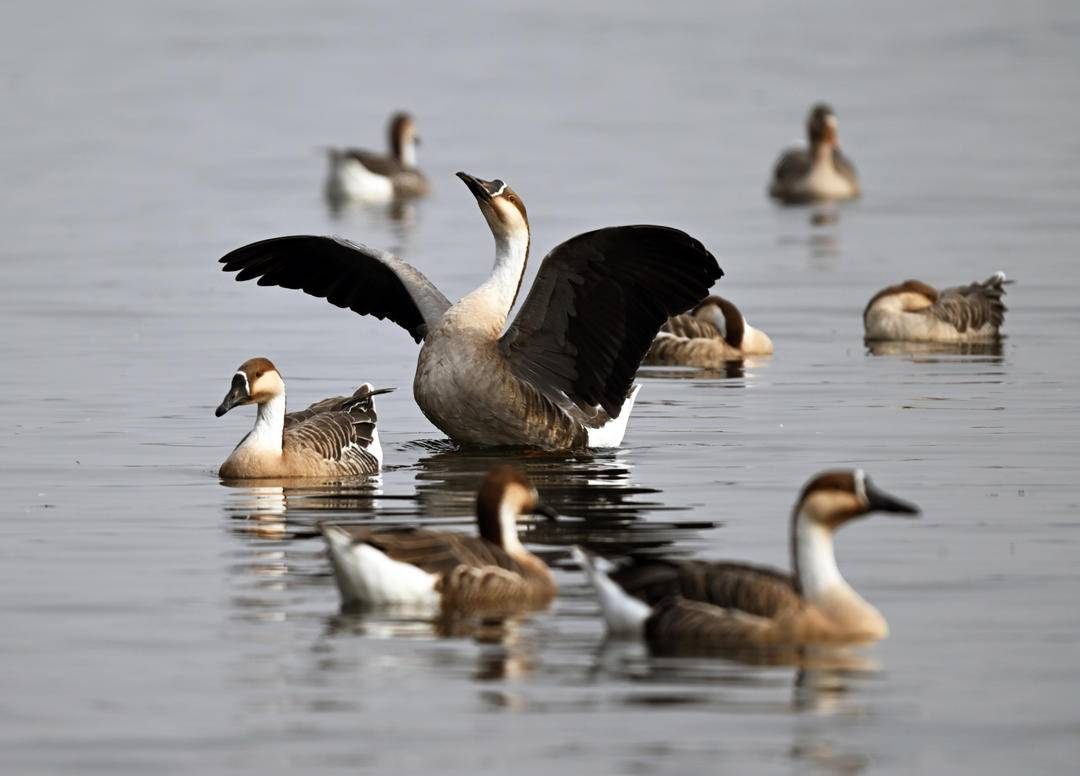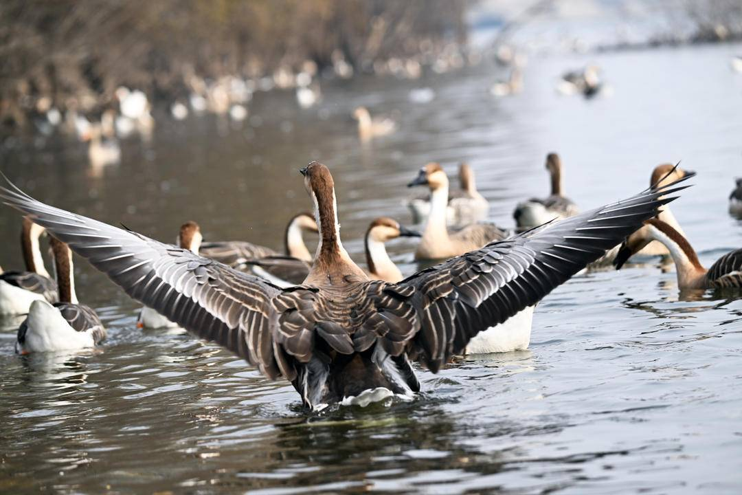 The swan geese move in small groups or large flocks,occasionally soaring high into the air and blending with the surrounding natural scenery,to present a harmonious and beautiful ecological picture.They have become a unique and captivating sight in early winter,attracting citizens and tourists to admire and take photos.