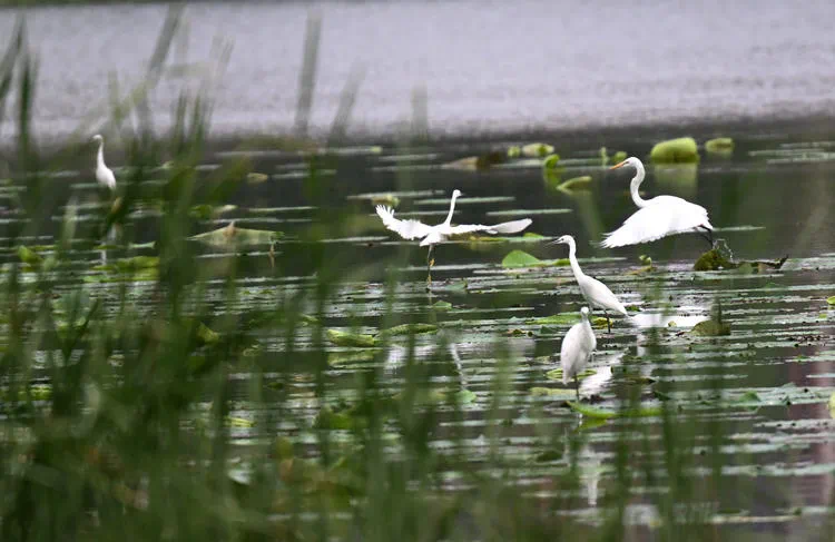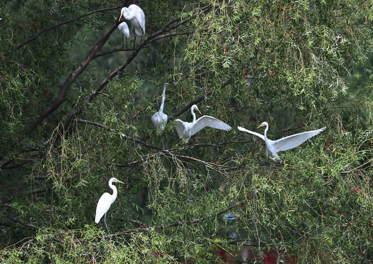 It's the White Dew,and egrets are active!In the Puhe Ecological Corridor of Shenbei New District,dozens of egrets inhabit in the trees on the central island of the river.