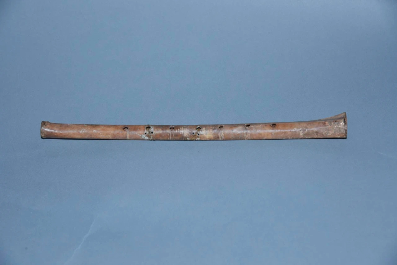 The exhibition showcases representative musical cultural relics from various historical periods from the Neolithic Age to the Qing Dynasty.One of the highlights is the Jiahu Bone Flute unearthed at the Jiahu Site in Wuyang County, Henan Province.The bone flute, with a total length of 23.6 centimeters, is made by the ulnar bones of cranes and is the earliest and most fully preserved wind instrument discovered in China to date and is known as "the first Chinese flute".