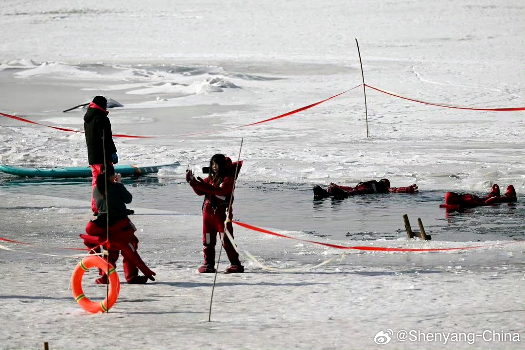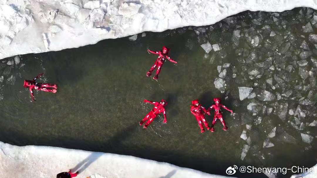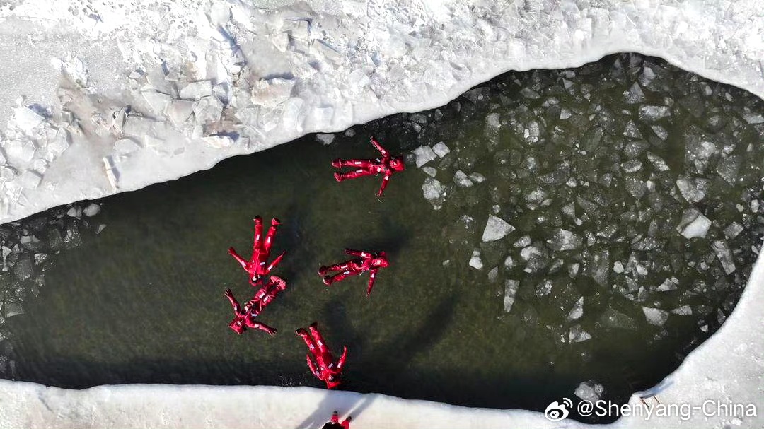 On January 25, a group of young people dressed in red thermal suits were seen experiencing the ice floating on the frozen river of Shenshuiwan Park. They were floating on the ice in groups of three or two, looking like "ice-cooled crayfishes", creating a unique sight in the winter.