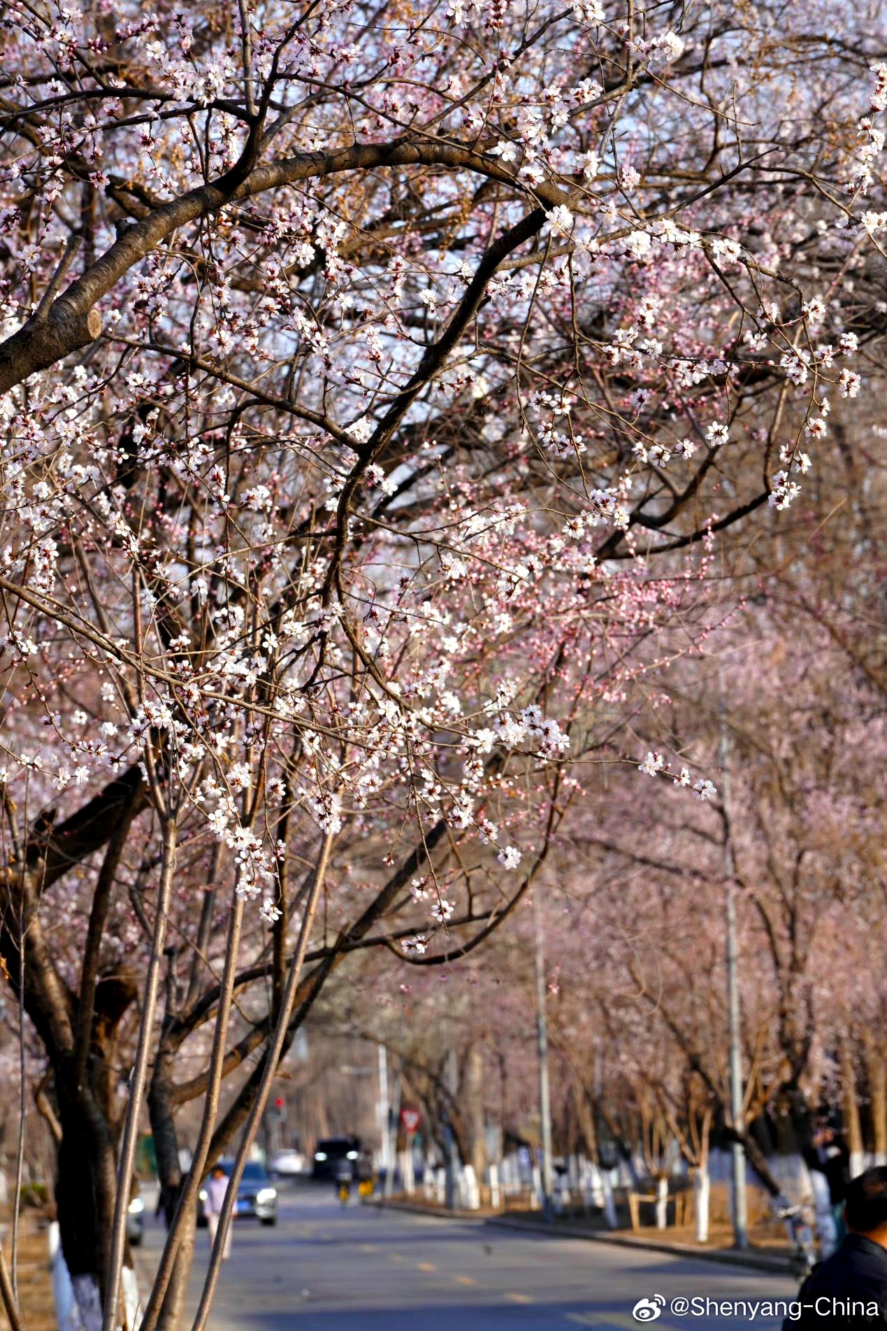 Xinluo Street in Hunnan District welcomes the peak flowering period of peach blossoms. On both sides of the street, peach trees have come into bloom. Their pink and white blossoms adorn the branches like a vibrant pink cloud.
