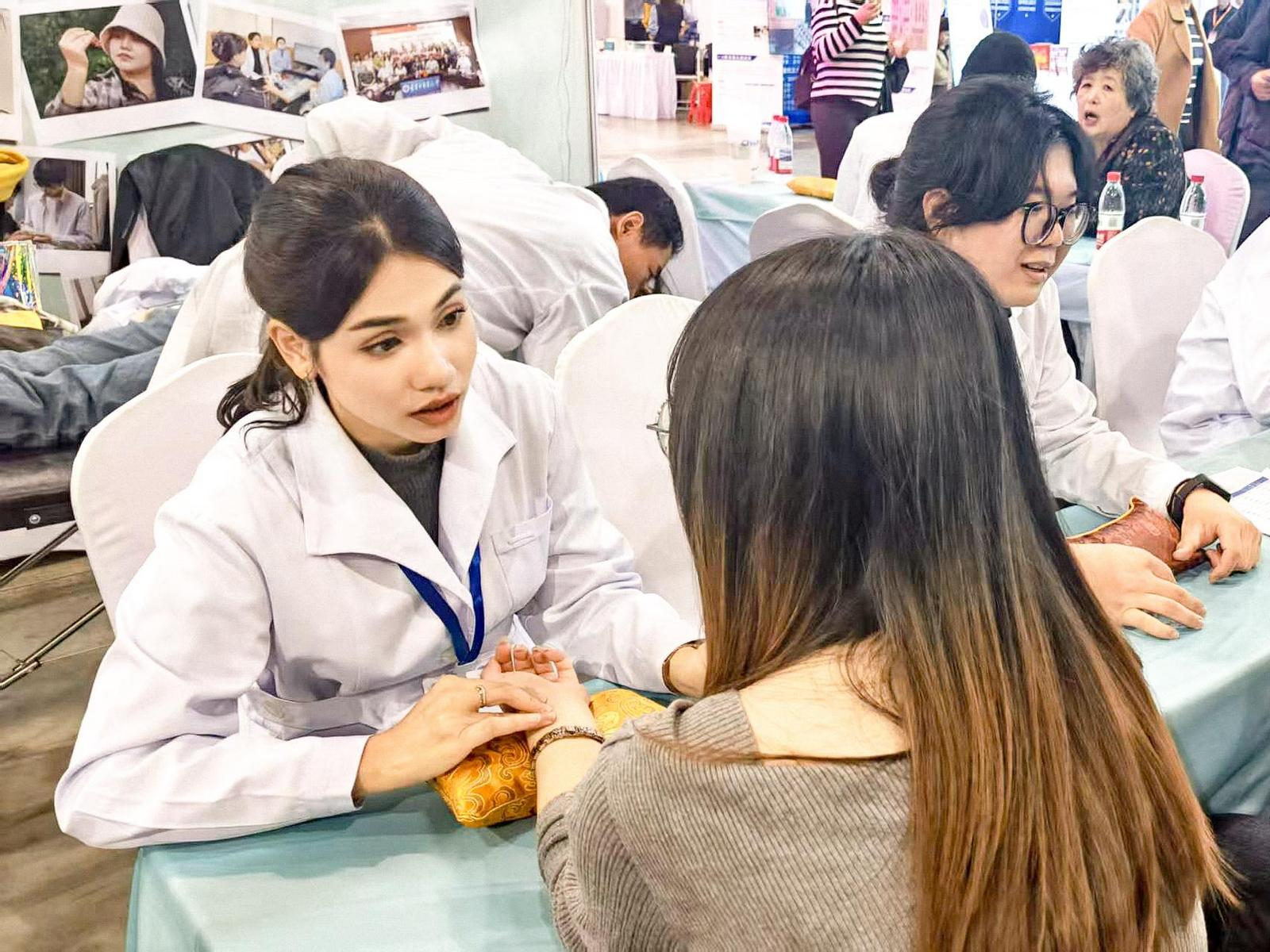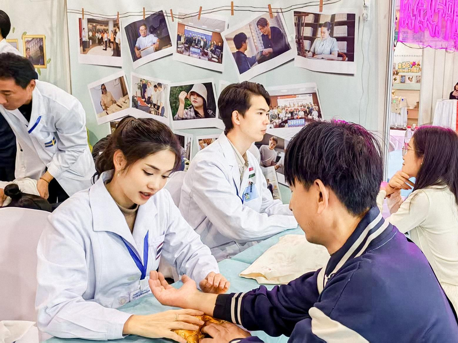 At the recently held 2nd Traditional Chinese Medicine Culture Night Market(Herbal Paste Festival)of Liaoning University of Traditional Chinese Medicine,Lin Xinyan,a doctoral student from Thailand,took pulses and gave massages to patients who came for consultation,achieving her first small goal during her study in China—participating in a free medical consultation.