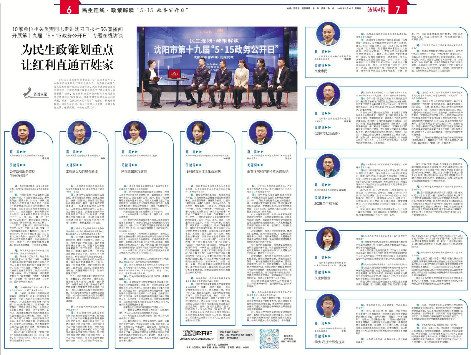 为了充分发挥新时代政务公开作用,沈阳市政府办公厅与沈阳日报、沈阳发布客户端联合举办了“民生连线·政策解读”活动,来自全市10家单位的相关负责同志走进沈阳日报社5G直播间,围绕沈阳市近期出台的利民政策,采用“在线访谈+互动问答”的形式,权威详细解读,回应社会关切,加大了政策公开力度,让群众知晓政策、理解政策,享受到政策红利。