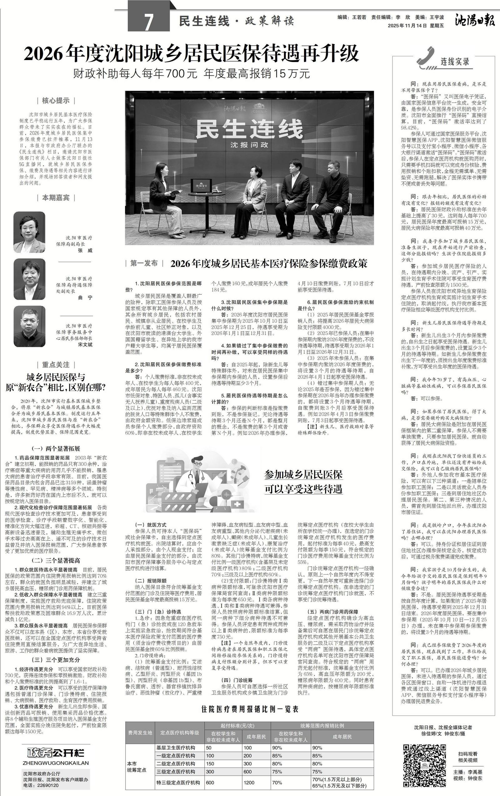 沈阳市城乡居民基本医疗保险制度已平稳运行五年,为广大参保群众带来了实实在在的福祉。目前,2026年度城乡居民医保集中参保缴费已拉开帷幕,11月13日,沈阳发布客户端、沈报全媒与市政府办公厅政务公开处联办的《民生连线》栏目,邀请沈阳市医保部门有关人士做客沈阳日报社5G直播间,就城乡居民医保参保、缴费及待遇等相关内容进行详细介绍,并现场回答读者和网友提出的问题。