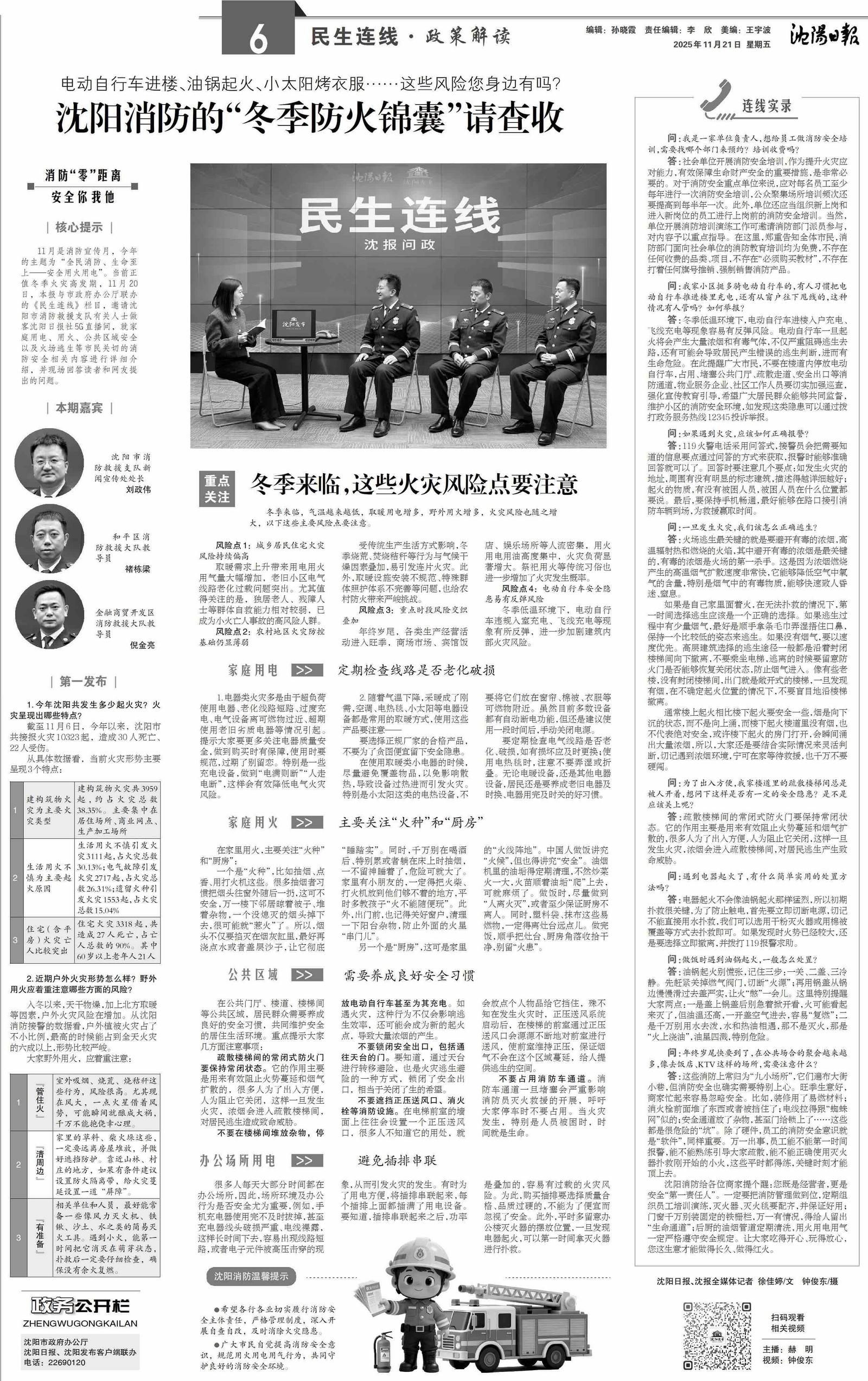11月是消防宣传月,今年的主题为“全民消防、生命至上——安全用火用电”。当前正值冬季火灾高发期,11月20日,沈阳日报、沈阳发布客户端与市政府办公厅联办的《民生连线》栏目,邀请沈阳市消防救援支队有关人士做客沈阳日报社5G直播间,就家庭用电、用火、公共区域安全以及火场逃生等市民关切的消防安全相关内容进行详细介绍,并现场回答读者和网友提出的问题。