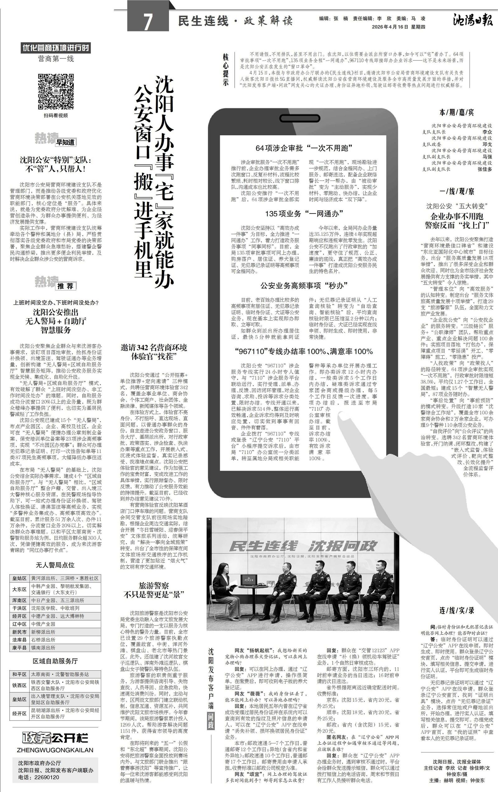 不用请假,不用排队,甚至不用出门。在沈阳,以往需要去派出所窗口办事,如今可以“宅”着办了。64项审批事项“一次不用跑”、135项业务全程“一网通办”、967110专线即接即办企业诉求——这不是未来场景,而是沈阳公安正在发生的“窗口革命”。