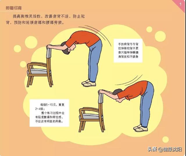 动作要点:双手扶着椅背,弓背,之后放松。整个练习过程中应有轻度酸痛和牵拉感,不应该有明显的疼痛。