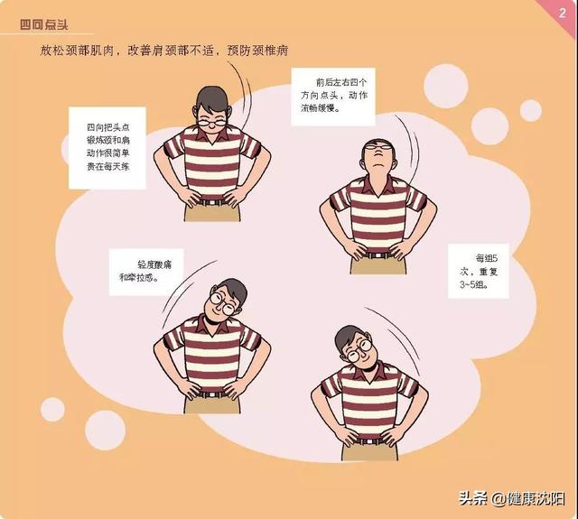 动作要点:前后左右四个方向点头,动作流畅缓慢。有轻度酸痛和牵拉感。