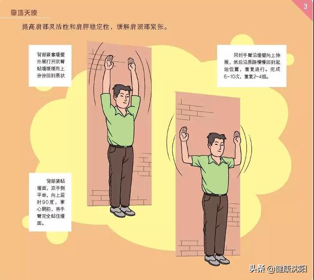 动作要点:背部紧贴墙面,双手侧平举,向上屈肘90度,掌心超前,将手臂完全贴住墙面。同时手臂沿墙壁向上伸展,然后沿原路慢慢回到起始位置,重复进行。