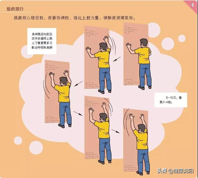 动作要点:身体稳定向墙上压,双手扶墙上下做爬行状,重复多次。
