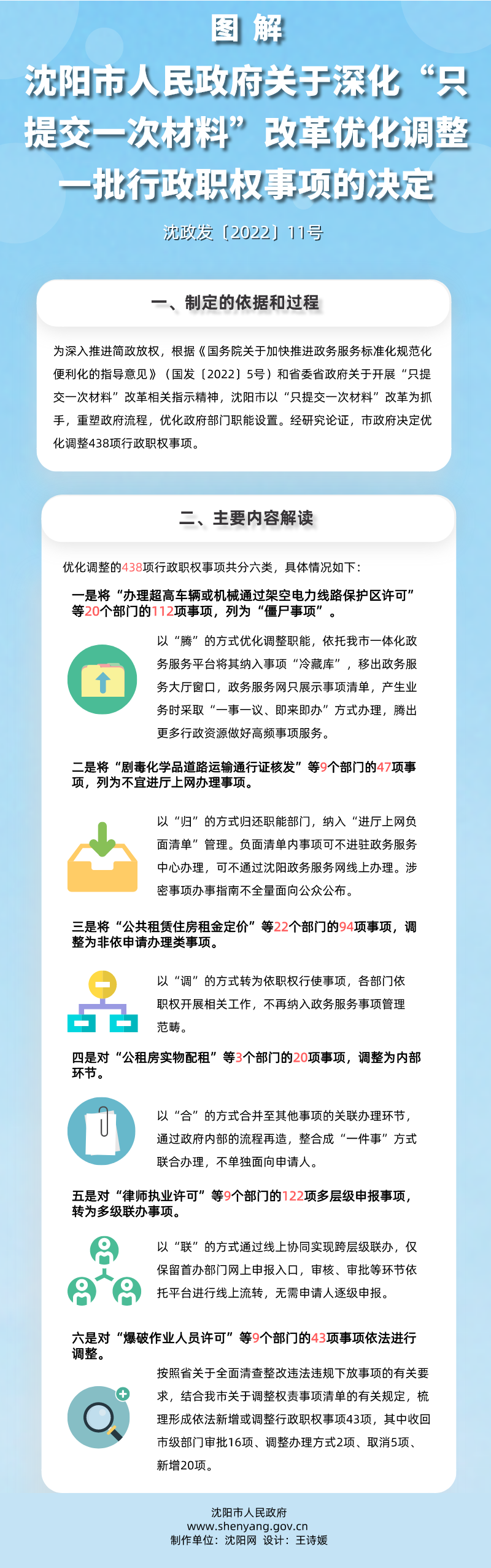 图解《沈阳市人民政府关于深化“只提交一次材料”改革优化调整一批行政职权事项的决定》
