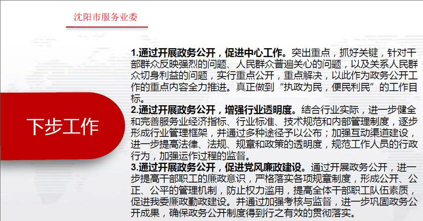 2.通过开展政务公开,增强行业透明度。结合行业实际,进一步健全和完善服务业经济指标、行业标准、技术规范和内部管理制度,逐步形成行业管理框架,并通过多种途径予以公布;加强互动渠道建设,进一步提高法律、法规、规章和政策的透明度,规范工作人员的行政行为,加强运作过程的监督。