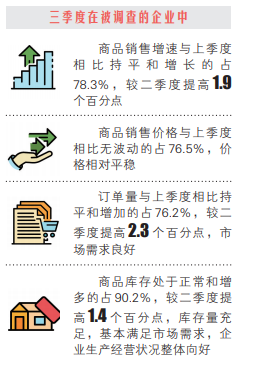 三季度,企业盈利与上季度相比基本持平。在被调查企业中,税费负担与上季度相比变化不大和下降的占90.7%,减税降费政策得到进一步落实;资金周转情况与上季度相比,资金正常和充裕的占84.9%,较二季度略有下降,资金紧张的企业主要依靠银行贷款缓解资金压力。