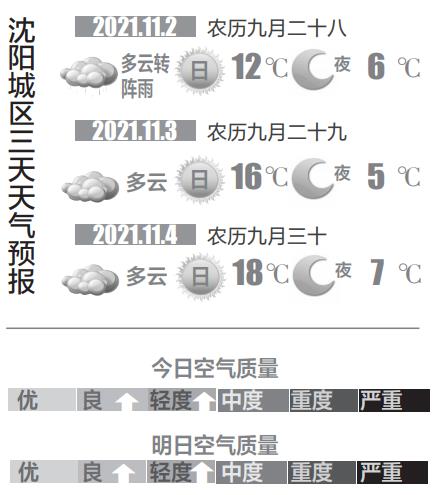随着降雨天气的出现,十一月也由降温拉开帷幕。不过秋末冬初,气温还是不稳定,本周二开始,沈城气温又开始小幅回升。周二白天天空云量越来越多,南风3到4级,最高气温12℃。周二夜间,又将有一次阵雨天气过程,不过对气温没有太大影响,最低气温6℃。