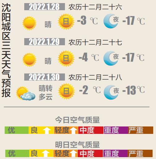 28日-30日,沈阳天气相对比较稳定,没有明显的雨雪天气来打扰。阳光坚守岗位,最高气温在-2℃到-4℃,最低气温在-13℃到-17℃,对于大家外出置办年货、居家扫屋洗晒都非常合适。大家外出不要忽略保暖,咱们健健康康过大年。