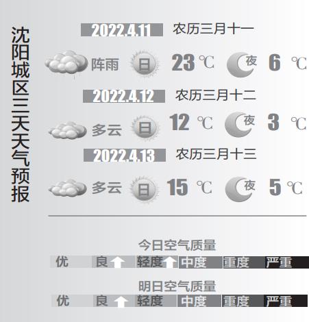 今天白天,尤其是午后开始,沈阳地区有阵雨,并可能伴有今年的第一声春雷,不过雷声不大。西南风4-5级,最高气温还维持在23℃,但阴雨天气下,体感温度将大打折扣。夜间天空逐渐转为多云,最低气温6℃。周二冷空气正式上岗,白天是多云天气,风向转为偏北风4-5级,气温大幅度下滑,最高气温只有12℃。夜间天空转为多云,最低气温3℃。