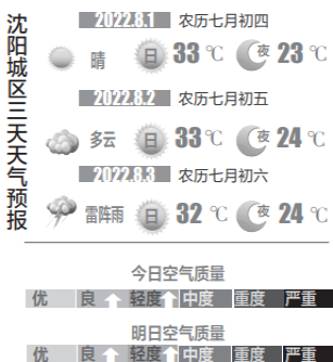 新一周的开始又是崭新8月的开启,沈城依然是晴好天气。由于近期雨水大,潮气就大,尤其在三伏天里。当气温达到一定的高度时,闷的感觉就会相伴左右。周一、周二两天最高气温在33℃左右,最低气温在23℃到24℃之间,提醒大家注意防暑降温。