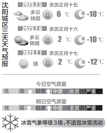 今天是元宵佳节,白天天空云量较多,但最高气温像“坐火箭”一样升到6℃附近,大家外出要适当调整着装。晚间天空状况对欣赏“元宵月”来说比较困难,但气温回升对于外出赏灯比较有利,大家外出还是不要忘记保暖。