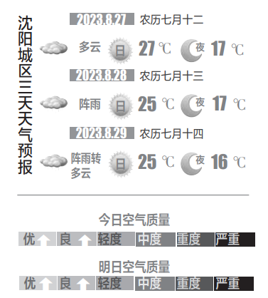 周日沈城有云也有阳光,最高气温在27℃左右,最低17℃上下,天气比较给力,偏北风相伴,十分清爽舒适,非常适宜大家外出游玩儿,只是紫外线辐射依然较强,补水防晒仍不可少。下周一到周二白天,受冷空气影响,沈城将有阵雨或雷阵雨光临,最高气温在25℃左右,最低气温在16℃到17℃之间,提醒外出的市民要带好雨具,雨水过后周三沈城转为多云天气,气温变化不大,此季节正值夏末初秋,昼夜温差也渐渐拉开距离,早晚凉意开始显现,年老体弱人群要注意增加衣物,以免着凉感冒。