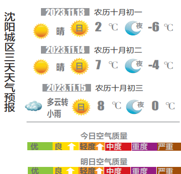 周一早晨体感寒冷,上班、上学都要穿戴保暖。周一到周三天空由晴转为多云,阳光不断积累热量后,气温小幅回升,最高气温由2℃回升至8℃,最低气温也由-6℃回升至0℃,周三或将成为本周气温最高的一天。(沈阳晚报、沈报全媒体主任记者 吕佳)