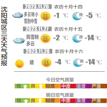 周日夜间,沈城有小到中雪,并将出现道路积雪现象,下周一早上外出最好打出提前量,观察路况,小心慢行。周一白天还有点儿阵雪,气温在-12~-4℃,北风天气将导致风寒效应,放大寒冷的感受,使得体感温度比实际气温更低,一定要注意穿戴保暖。(沈阳晚报、沈报全媒体主任记者 吕佳)