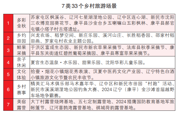 9月9日,记者从沈阳市文化旅游和广播电视局了解到,2024爱沈阳“秋韵情意浓 沈阳别样红”秋季游活动推出多彩金秋、乡约田园、鲜果采摘、亲子休闲、文化体验、乡村赛事、美宿露营7类33个乡村旅游场景。(沈阳日报、沈报全媒体记者谢飞燕)
