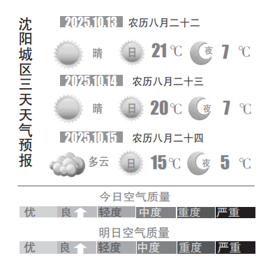 眼下沈城秋意逐渐变浓,树上依然涂抹着浓绿,树下却开始铺上了“金黄”,美得如画一般。10月12日,记者从沈阳市气象部门获悉,预计周一(13日)、周二(14日)两天,阳光积极上岗打卡,沈城气温有所回升,最高气温在20℃到21℃之间,最低气温在7℃上下,而且风力不大。“秋阳和煦”伴左右,秋叶也悄然“上红妆”,好天气配上合适的温度,正是出游赏秋的好时节,但需要提醒外出的市民,要注意防晒和补水。