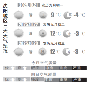 10月20日,记者从沈阳市气象部门获悉,根据最新的气象资料分析,预计周二到周四(21日至23日),沈城天气晴好,气温呈逐渐回升的态势,最高气温在9℃到12℃之间,最低气温在-3℃到-4℃之间,这样的天气比较适宜户外活动,大家可以利用中午时段出去散散步,欣赏一下大自然的美丽景色,但早晚寒意明显,大家外出要注意保暖,以免感冒。