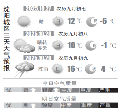 10月26日,记者从市气象部门获悉,预计周一(27日),沈城虽然阳光明媚,最高气温却下降至8℃左右,最低气温下降至-6℃附近。周二(28日)白天沈城是晴有时多云,南风回归,最高气温回升至10℃左右;夜间局部地区有分散性阵雨,最低气温在4℃附近;周三(29日)沈城有阵雨,气温继续上升,最高气温来到16℃附近,夜间最低气温维持在4℃左右;周四(30日),沈城将再迎气温下降。(沈阳晚报、沈阳发布客户端记者徐佳婷)