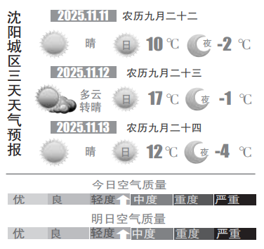 其中,周二(11日)太阳在岗、阳光明媚,最高气温在10℃上下,最低气温在-2℃附近;周三(12日)冷空气撤离,暖气团上线,气温顺势回升,在西南大风的助推下,最高气温被推到17℃的舒适区间,最低气温在-1℃附近,由于风力偏大,大家需要注意防风防火。这两日的沈城,反倒藏着秋末的余温,很适合开展户外活动,但需要注意合理穿衣;另外,近期进入流感高发季,建议大家饮食均衡、保证睡眠,勤洗手、常通风,外出科学佩戴好口罩。(沈阳晚报、沈阳发布客户端记者徐佳婷)