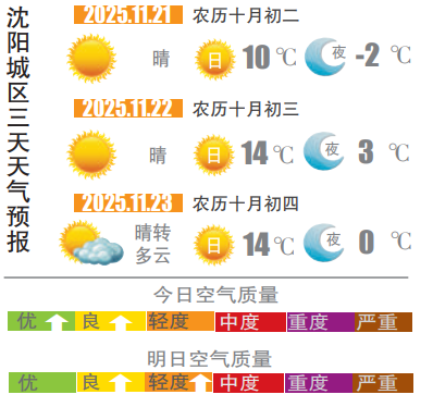 11月20日,记者从沈阳市气象部门获悉,预计周五开始到周日,沈城晴好的天气将持续在线,气温逐步回升,周五小幅升温铺垫暖意,最高气温来到10℃附近,最低气温在-2℃左右,西南风2~3级,体感相对比较舒适。