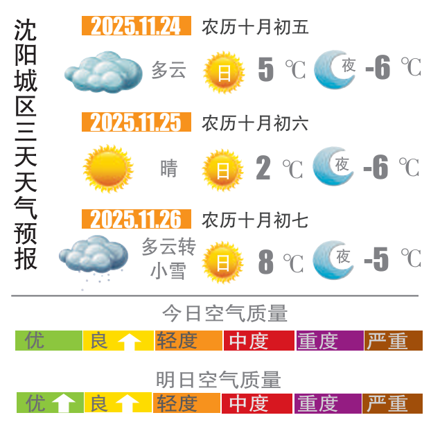 预计,周一(24日)最高气温骤降至5℃,相比前一天下滑了9℃,夜间最低气温-6℃,再加上北风相伴,且多云的天气,让本就不温暖的体感雪上加霜;周二(25日)寒冷“加码”,最高气温继续下滑至2℃,最低气温仍然在-6℃,好在阳光毫无保留地提供热量,但大家仍要“叠穿护体”,注意穿戴保暖;周三(26日)最高气温短暂回升到8℃,算是冷空气给的“喘息机会”,但夜间最低气温-5℃仍在“续航”,早午温差13℃,晚上会有一次雨雪天气过程;受冷空气影响,周四(27日)夜间到周五(28日)早晨,最低气温将降到-9℃左右,寒气逼人,大家要做好保暖。(沈阳晚报、沈阳发布客户端记者徐佳婷)
