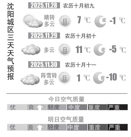周末两天气温将呈现两极分化——周六暖,周日冷。其中,周六在4~5级西南大风的鼓动下,最高气温飙至11℃。不过,夜间新一轮冷空气携风带降温抵达,周日白天有阵雪,最高气温再次降至1℃,最低气温降至-10℃。气温起起伏伏,建议大家要及时关注气温走势,做好穿着和出行安排。(沈阳晚报、沈阳发布客户端记者徐佳婷)