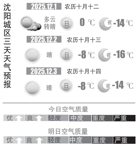 11月30日,记者从沈阳市气象部门获悉,受上周日抵达的冷空气影响,沈城周一早最低气温跌至-10℃以下,然而这只是此次降温的开始。周一白天天空完全放晴之后,降温将愈演愈烈,最低气温降到-14℃。周二最低气温降至-16℃,周三最低气温在-14℃附近,这两天白天的最高气温只有-8℃。本周前三天虽然算不上极寒,但绝对是很冷,提醒大家把为冬天准备的最厚的衣服穿上;有晨练习惯的朋友,这几天不妨把锻炼时间调整到10时至16时的暖阳时段;心脑血管疾病患者、呼吸系统疾病患者,还有老年人和婴幼儿,尽量不在早晚低温时段外出。