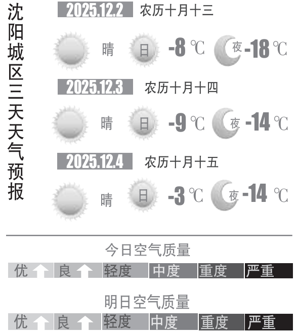 预计,周二(2日)、周三(3日)两天,在补充冷空气的影响下,沈城最高气温骤降至-8℃~-9℃,比周一的最高气温还要再低8℃,夜间最低气温在-18℃上下,将刷新今年入冬以来气温新低。与此同时,虽然阳光在线,但在偏北风的助力下,体感温度还可能因“风寒效应”再降一级;周四(4日)到本周末,随着冷空气的离开,沈城气温在阳光的助力下开始小幅回升,周五(5日)最高气温将回升至0℃以上。