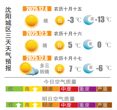 连日来,沈城被严寒包裹,晴冷天气全程在线。12月3日,记者从沈阳市气象部门获悉,预计周四沈城云朵与暖阳温柔相拥,白天最高气温将回升至-3℃左右,最低气温仍在-13℃上下,提醒外出的市民防寒保暖不可松懈,仍要穿厚实衣物,守护身心暖意。