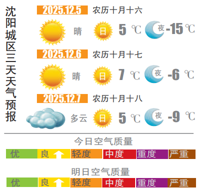 12月4日,记者从沈阳市气象部门获悉,尽管周五早晨仍然十分寒冷,最低气温-15℃,但随着阳光升起,沈城气温将要迎来一场“大翻身”。在平均4~5级、阵风可达7级的偏南大风助力下,白天最高气温将猛地跃升至5℃,夜间最低气温也悄悄回到0℃附近。大家需要注意的是,周五早午温差可达20℃,穿衣要做好搭配,方便随时穿换。