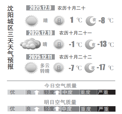 本周冷空气较为活跃,将为沈城带来降温和雨雪天气,一次在周中,一次在周末。12月8日,记者从沈阳市气象部门获悉,预计今天(9日)沈城天空还是以晴为主,气温早晨出门有些冷,但白天最高气温仍保持在0℃以上,整体还算稳当。
