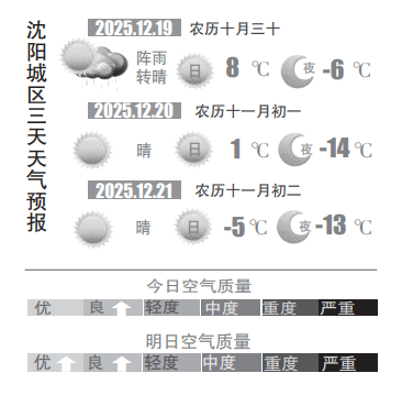 雨雪过后,气温明显下降。预计双休日两天,阳光虽然“加班值守”,沈阳气温却止不住地往下降,最高气温将降至1℃到-5℃,最低气温在-13℃到-14℃。值得一提的是,本周日(21日)正式迈入“数九”时节,寒冬大幕就此拉开,天气也格外应景,预计下周初,沈阳将迎来新一轮降雪降温天气,建议大家密切关注临近气象预报,提前做好防寒防雪准备。(沈阳晚报、沈阳发布客户端记者徐佳婷)