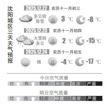 上周日(12月21日)我们迎来了冬季的第四个节气——冬至,冬至日是北半球昼最短、夜最长的一天,也是数九寒天的开始。当天,记者从沈阳市气象部门获悉,预计周一(22日),太阳若隐若现,4~5级西南大风下,沈城白天最高气温一鼓作气来到3℃;后半夜雪花飘飘,夜间最低气温在-8℃左右。